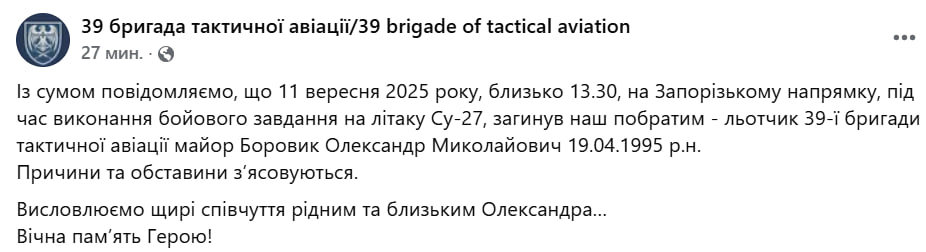 11 сентября на Запорожском направлении погиб летчик 39-й бригады тактической авиации майор Александр Боровик. Он выполнял боевое задание на самолете Су-27, когда случилась трагедия.