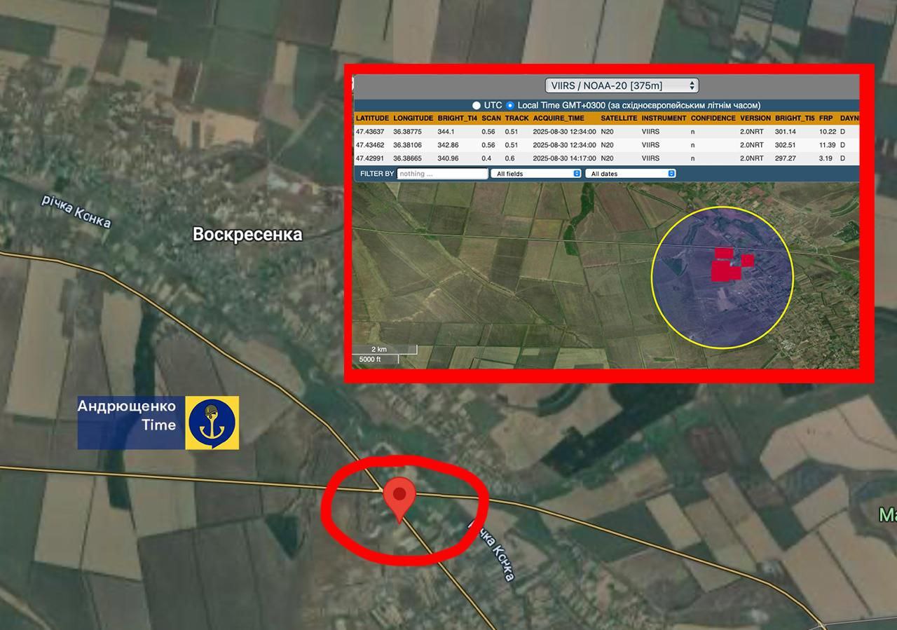 Точные координаты попадания — 47.43636, 36.38773, уточнил Андрющенко. Также добавляется скриншот карты пожаров FIRMS NASA, на которой красным обозначено, где произошло возгорание.