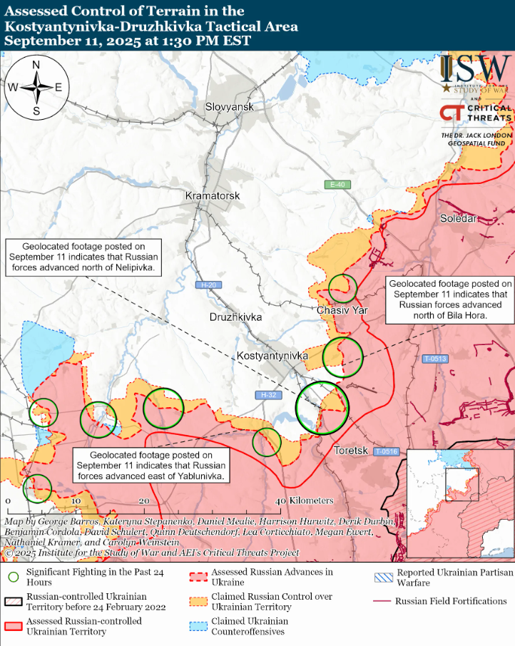 Наступление ВС РФ имело успехи в тактическом районе Константиновка–Дружковка согласно отчету американского Института изучения войны (ISW) за 11 сентября. Аналитики утверждают со ссылкой на геолокационные видеозаписи, что российские войска продвинулись на нескольких направлениях возле Константиновки.