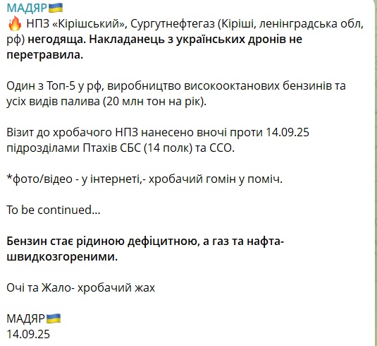 Командующий Силами беспилотных систем Вооруженных сил Украины Роберт "Мадяр" Бровди подтвердил атаку на предприятие утром 14 сентября и пообещал продолжение.