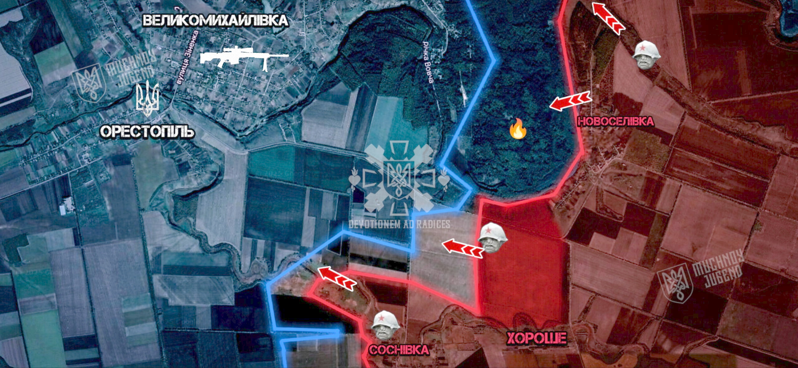 Продолжается наступление Вооруженных сил Российской Федерации, которые давят на позиции Вооруженных сил Украины в Днепропетровской области. Карта боевых действий показывает, что россияне оккупировали минимум два села и давят в еще десятке точек.