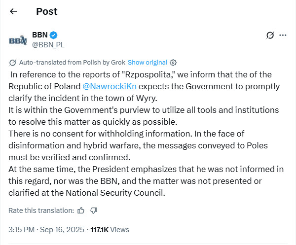 Как пишет RMF24, реакцию главы государства обнародовало Бюро национальной безопасности в соцсети Х. Там отметили, что президент требует быстрого и полного расследования инцидента, а правительство должно применить все доступные институты для выяснения причин происшествия.