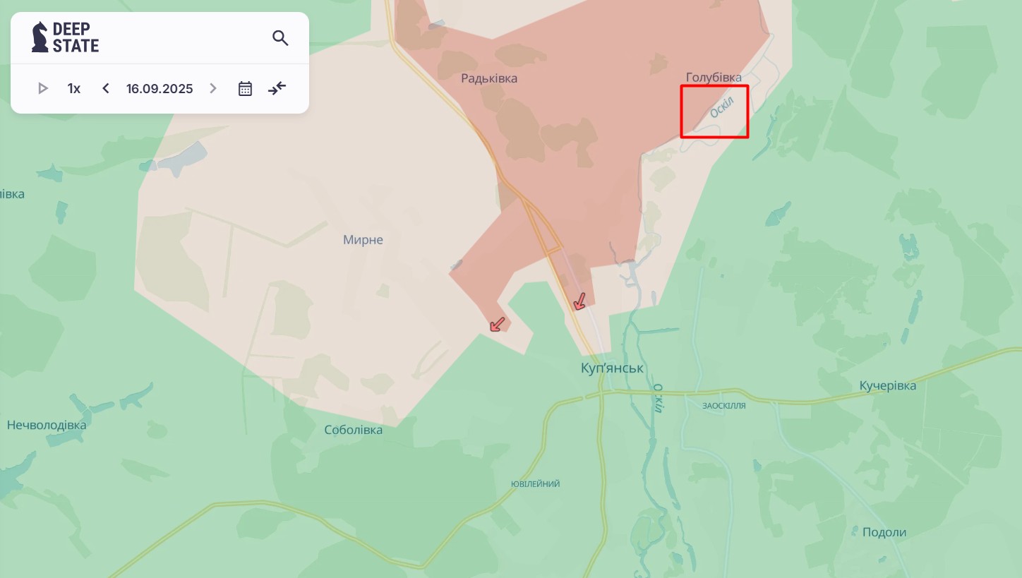 Аналитики назвали еще одну точку, в которой продвинулись ВС РФ, — это село Голубовка. На карте проекта линия боев сместилась на 200 м на юг и остановилась по берегу реки Оскол.