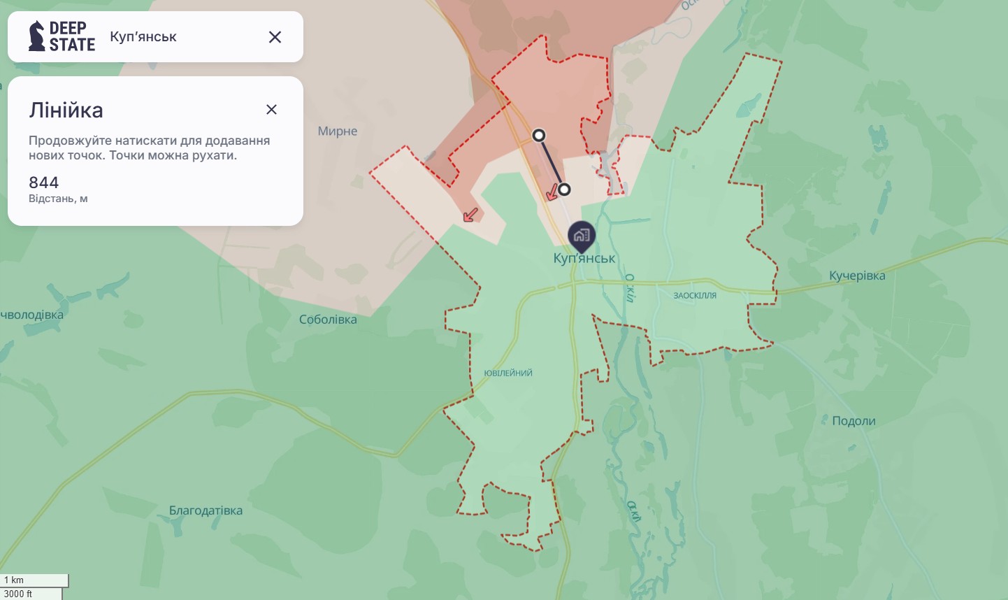 Данные проекта показывают продвижение россиян на 800 м вглубь Купянска, а до центрального перекрестка трассы R79 и улицы Дзержинского — около 1,3 м. Кроме того, можно примерно оценить оккупированную площадь: это, ориентировочно, около 3-5 кв. км (от города на 33 кв. км).