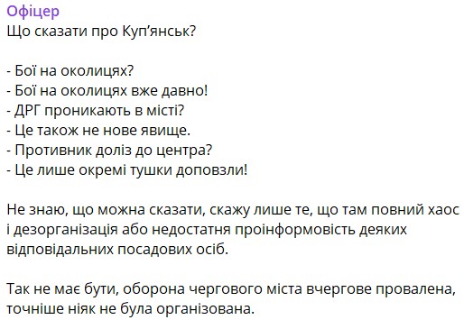 О ситуации в Купянске днем 17 сентября написал в Telegram-канале лейтенант Сил обороны Украины с позывным "Алекс". Военный отметил, что российские ДРГ регулярно пытаются зайти в город, а бои в окрестностях продолжаются уже давно. По его словам, некоторые россияне действительно могли добраться ближе к центру, но их очень мало. В то же время, офицер заявил, что в Купянске плохо наладили оборону.