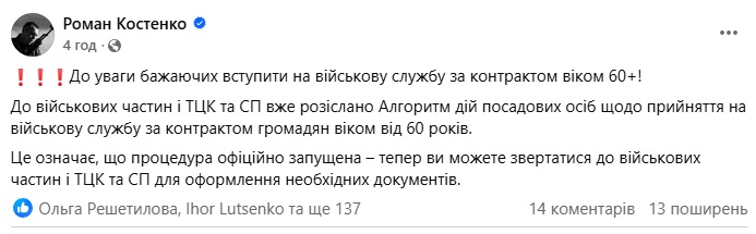 Народный депутат Украины и полковник СБУ сообщил о новой программе у себя на Facebook. "В воинские части и ТЦК и СП уже разослан Алгоритм действий должностных лиц по принятию на военную службу по контракту граждан в возрасте от 60 лет", — сообщил Роман Костенко.