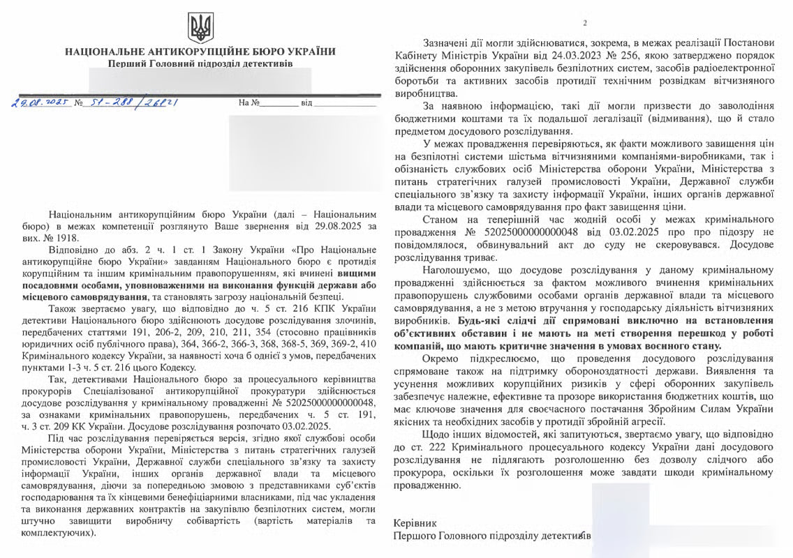 Национальное антикоррупционное бюро Украины (НАБУ) проводит более широкое расследование в отношении государственных служащих, в частности направило запросы к полудюжине украинских производителей беспилотных систем, среди которых Fire Point. Следователи проверяют, могли ли чиновники сговариваться с компаниями для искусственного завышения производственных затрат.