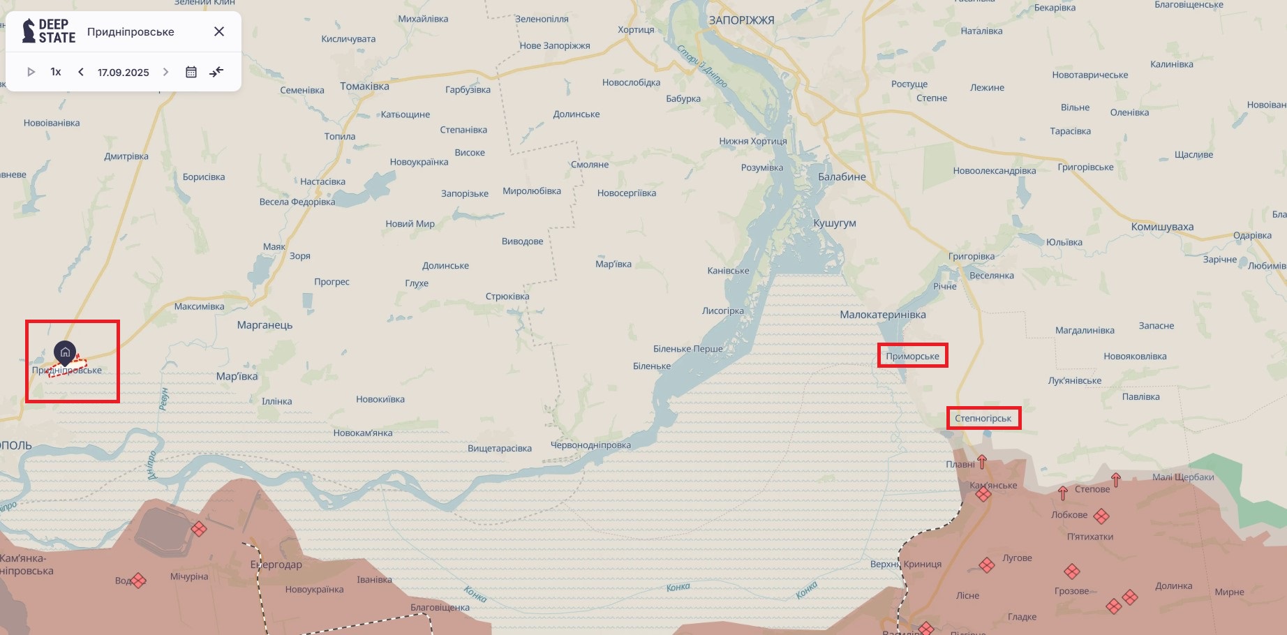 Вместе с тем, согласно картографическим данным ресурса DeepState, большая часть населенного пункта уже находится под контролем Вооруженных сил РФ. А севернее вплоть до Степногорска остальная территория обозначена как "серая зона". Аналитики указали направление удара противника — в сторону Степногорска, севернее которого находятся населенные пункты Приморское и Григоровка, расположенные на подступах к Запорожью.