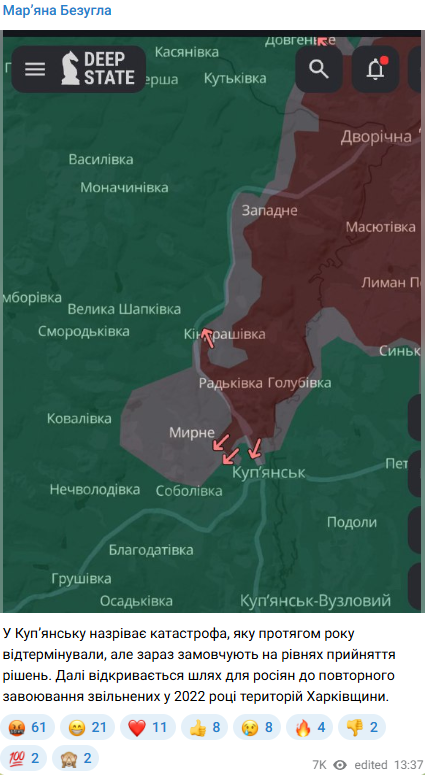 "В Купянске назревает катастрофа, которую в течение года отсрочили, но сейчас замалчивают на уровнях принятия решений. Далее открывается путь для россиян к повторному завоеванию освобожденных в 2022 году территорий Харьковщины", — написала Безуглая.