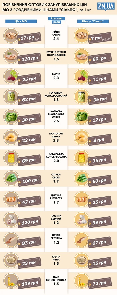 Например, 50% стоимости общей поставки по договору, а это около 1,2 млрд грн, пришлось всего на 40 видов продуктов из 409, а цены на них были завышены. И наоборот, 27 видов продуктов с заниженными ценами было поставлено для ВСУ на сумму всего 3,6 млн грн., что составляет лишь 0,14% стоимости таких продуктов.