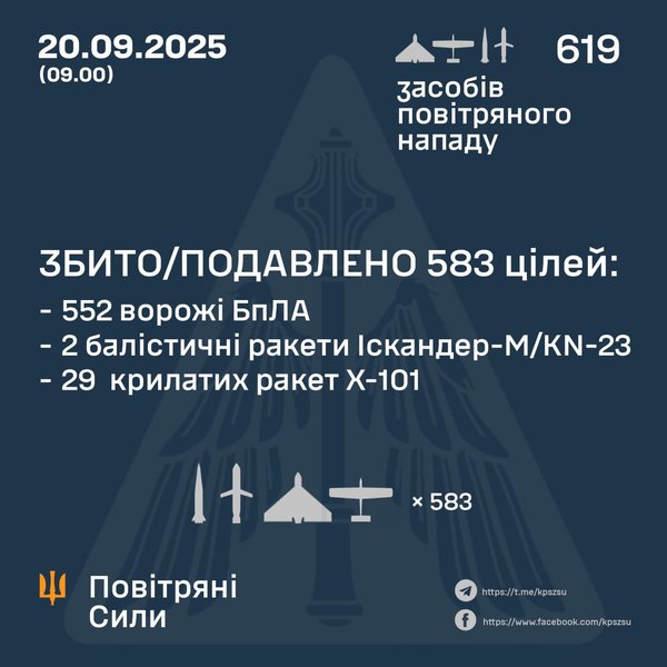 В ночь на 20 сентября ВС РФ нанесли по территории Украины комбинированный удар, применив ударные БпЛА, а также ракеты воздушного и наземного базирования.