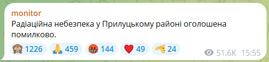 "Радиационная опасность в Прилуцком районе объявлена ошибочно", — сообщили на мониторинговых каналах.