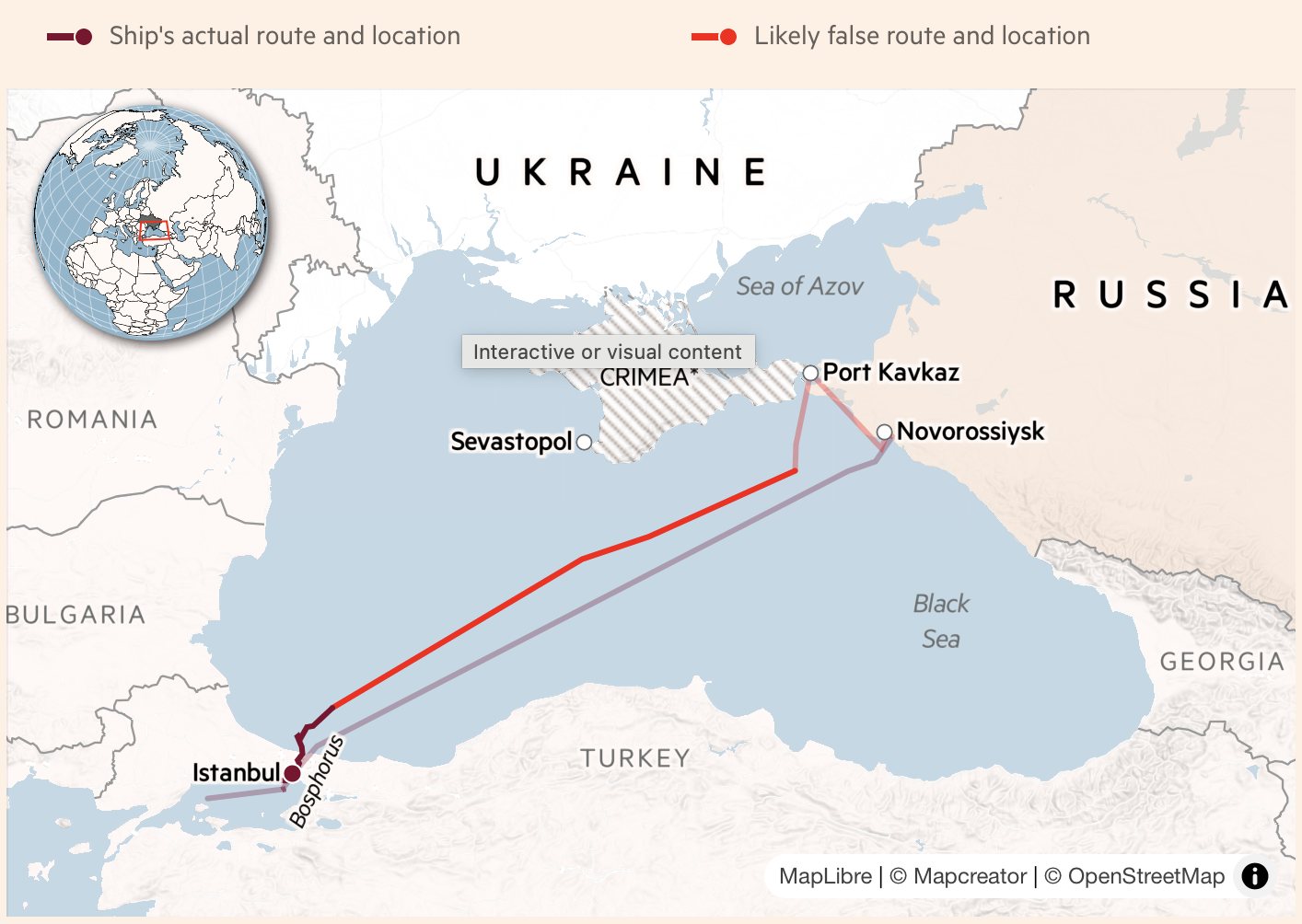 В какой-то момент реальный маршрут снова начал совпадать с официальным. 17 сентября Heng Yang 9 прибыл в Стамбул, и контейнеры на его палубе были расположены именно так, как они выглядели в Крыму. Компания-владелец не ответила на запросы о комментарии.