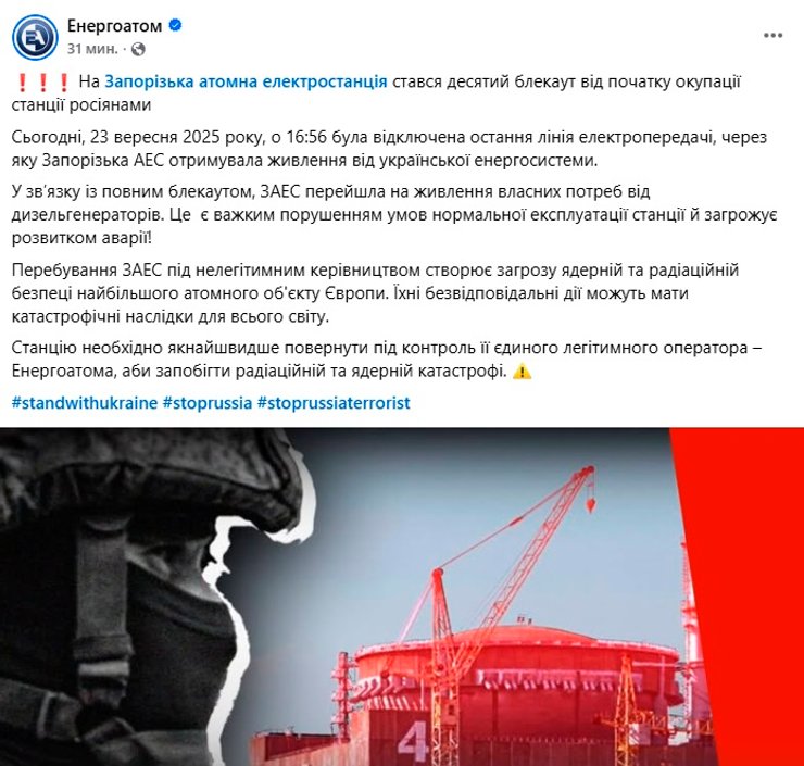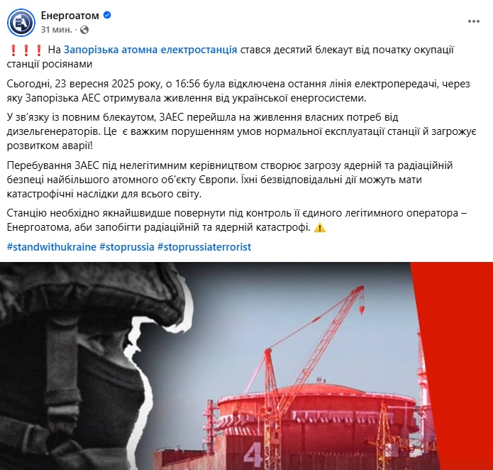 Последняя линия электропередачи, через которую Запорожская АЭС получала питание от украинской энергосистемы, была отключена 23 сентября в 16.56. Станция вынуждено перешла на питание от дизельгенераторов.