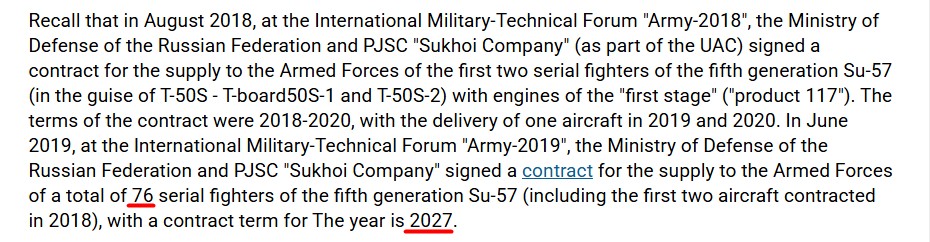 Авиация РФ — информация о сделке на Су-57 2018-2027 гг.