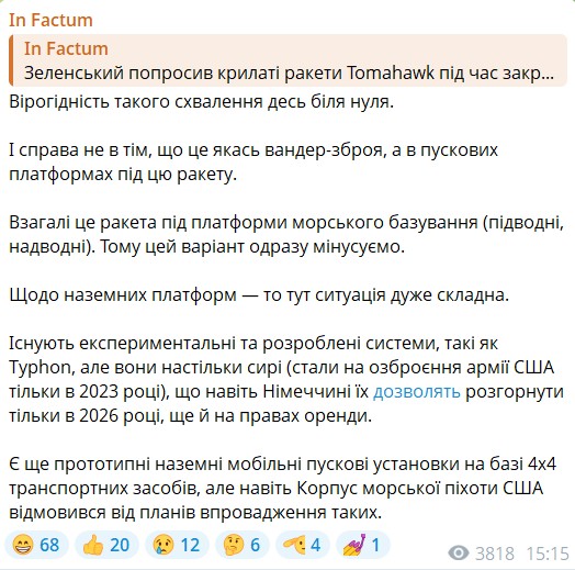 После информации The Telegraph о возможности предоставления ракет Tomahawk Украине на событие отреагировали в аналитическом Telegram-канале In Factum. Отмечается, что проблема не в ракетах, а в пусковых. В частности, нулевые шансы на пуски с надводных и подводных платформ. Кроме того, наземные платформы Typhon ожидаются в Германии только в 2026 году.