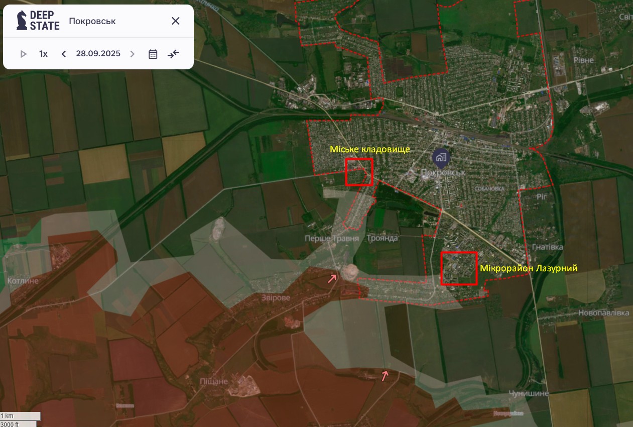 Вооруженные силы Российской Федерации атакуют южные районы Покровска и сумели расширить "серую зону", в которой продолжаются бои. Среди прочего, россияне подошли к городскому кладбищу и микрорайону "Лазурный".