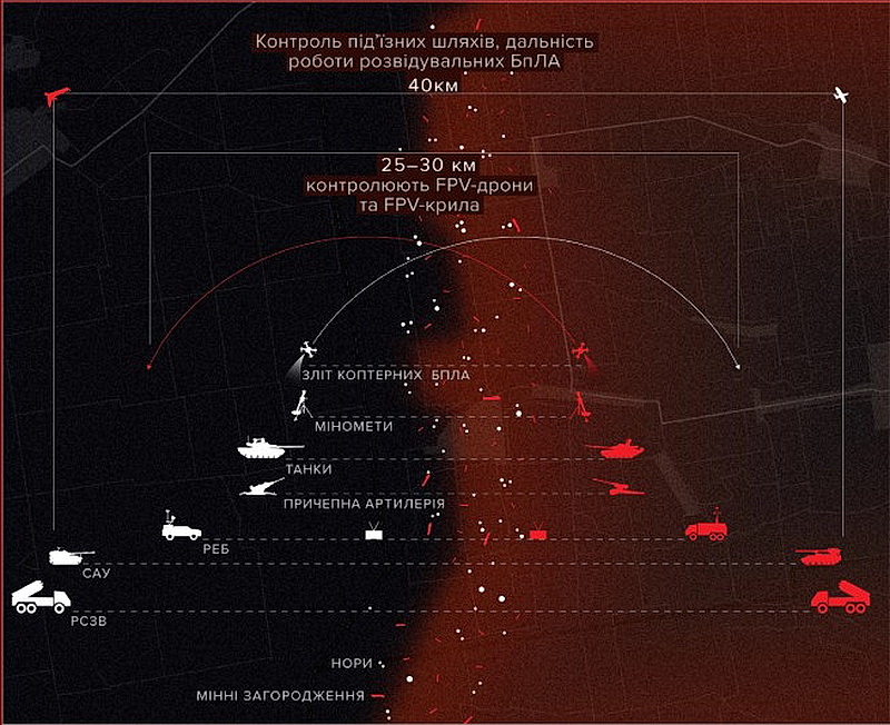 На портале создали инфографику, на которой показали структуру "серой зоны" и "килзоны", сформированных под влиянием дронов — FPV-коптеров и FPV-крыльев (БпЛА самолетного типа). На изображении выделено условных три полосы — по степени опасности и возможностям средств поражения.