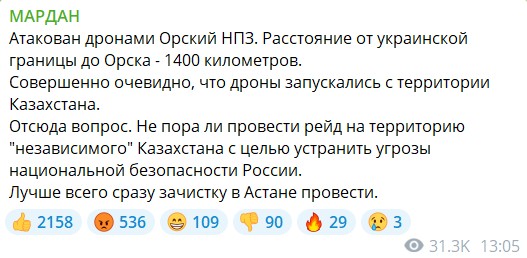 Утром 3 октября российский пропагандист Сергей Мардан написал в Telegram, что атаку дронов на Оренбургскую область устроили с территории Казахстана. После этого он призвал немедленно "зачистить" Астану и провести вторжение в "независимый Казахстан" под предлогом "рейда". Россияне, подписанные на канал пропагандиста, поддержали такое предложение и наставили больше 2 тыс. "лайков" под постом.