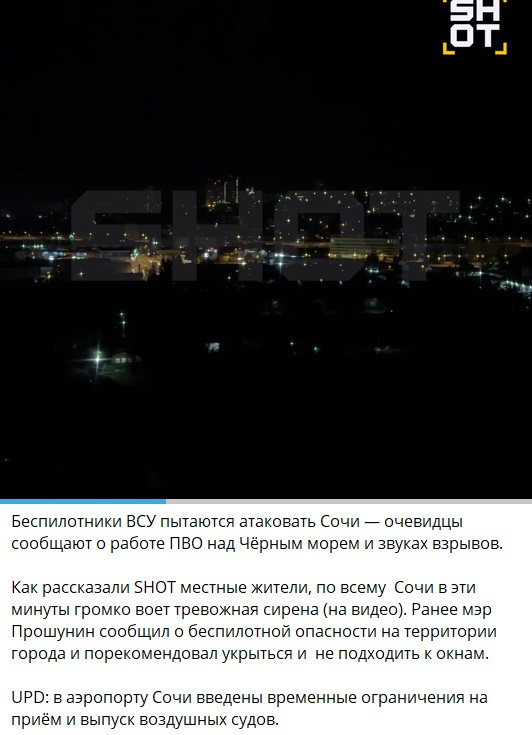 Около 21:30 по киевскому времени (22:30 по московскому) были закрыты аэропорты в Сочи и Геленджике, а через полчаса мэр Сочи Андрей Прошунин предупредил жителей города о налете дронов и опубликовал дежурные правила поведения в таких случаях.