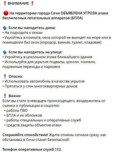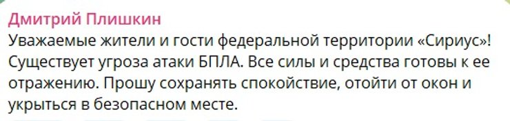 "Уважаемые жители и гости федеральной территории "Сириус"! Существует угроза атаки БПЛА. Все силы и средства готовы к ее отражению. Прошу сохранять спокойствие, отойти от окон и укрыться в безопасном месте", – написал он в соцсетях.