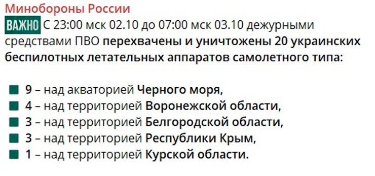 В Минобороны РФ сообщили, что в период с 21:30 2 октября до 07:00 3 октября силы ПВО и РЭБ ликвидировали 9 украинских дронов над акваторией Черного моря и еще 3 цели — в Крыму.