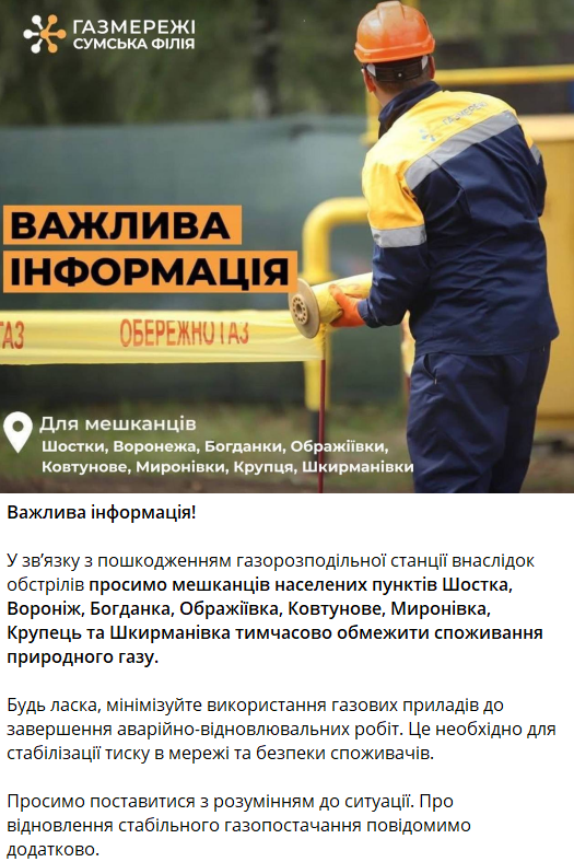 Сотрудники сумской филии "Газсети" обратились к населению Шостки и прилегающих населенных пунктов ограничить потребление природного газа и минимизировать использование газовых приборов в связи с повреждением газораспределительной станции в результате обстрелов.