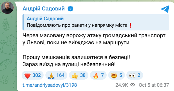 "Из-за массированной вражеской атаки общественный транспорт во Львове, пока не выезжает на маршруты. Прошу жителей оставаться в безопасности!", — написал Садовый после 6 утра.