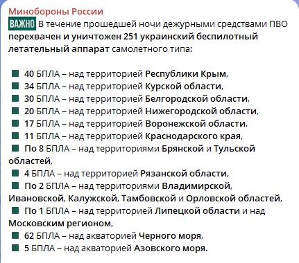 Согласно отчету Минобороны РФ, над территорией оккупированного Крыма уничтожено 40 БПЛА, над территорией Белгородской области – 30 БПЛА, над Нижегородской, где был атакован завод в Дзержинске – 20, а над территорией Брянской – 8.