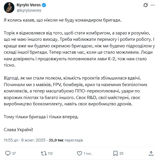 Сообщение Кирилла Вереса появилось в сети утром 6 октября. Военный изменил подпись аккаунта: теперь указывается, что он командир отдельной 20 бригады "К-2" Сил беспилотных систем. В коротком тексте он написал, что никогда не стремился стать комбригом, но теперь "не имеет другого выхода". Новый комбриг объяснил, что количество проектов выросло вдвое. Кроме того, если сначала бойцы воевали обычными "мавиками", FPV и бомберами, то теперь подразделение имеет собственную разработку R&D и мастерскую, отметил командир.