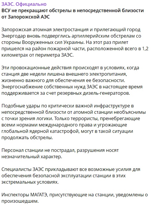 "Запорожская атомная электростанция и прилегающий город Энергодар вновь подверглись артиллерийским обстрелам со стороны Вооруженных сил Украины. На этот раз прилет пришелся на район пожарной части, расположенной всего в 1,2 километрах от периметра ЗАЭС. Эти провокационные действия происходят в условиях, когда станция две недели лишена внешнего электропитания, жизненно важного для обеспечения ее безопасности. Энергоснабжение собственных нужд ЗАЭС в настоящее время поддерживается за счет резервных дизель-генераторов", – говорится в сообщении.