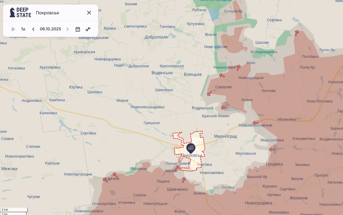 Вечером 6 октября военный с позывным "Мучной" написал в Telegram-канале о планах РФ в Покровске. По его оценкам, россияне имеют три основных направления атак, стремясь перерезать и контролировать трассу Е-50: до нее дошли в определенных точках и проникли в частную застройку. Первое направление — из микрорайона "Южный" в сторону центра (западный фланг), второе — от микрорайона "Шахтерский" до Собачовки (юг), третье — от "Солнечного" до Гнатовки и Рога (восток). По мнению бойца, российское командование накапливает силы и ресурсы под Покровском и планирует применить тактику не лобового наступления, а, скорее, обхода и "разлома".