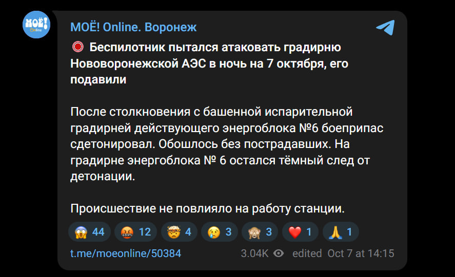 В ночь на 7 октября вблизи Нововоронежской атомной электростанции в Воронежской области произошел взрыв дрона. Российские источники утверждают, что аппарат пытался ударить по объекту, однако инцидент не повлиял на работу станции.
