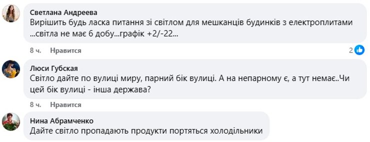 Местные жители, у которых уже который день нет газа и света, готовят еду во дворах на дровах и мангалах, а фотографиями делятся в соцсетях. В комментариях люди, у которых в домах стоят электроплиты, отмечают, что света нет по 22 часа, а также жалуются на то, что портятся холодильники и нет возможности хранить продукты.