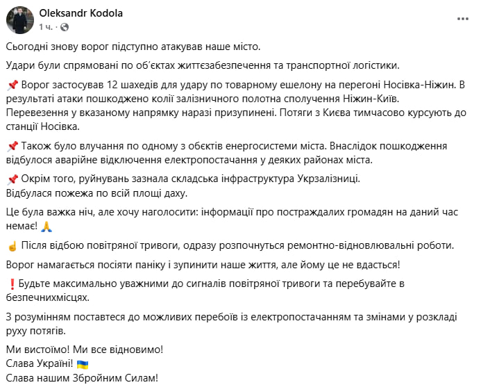 По информации городского головы Нежина Александра Кодолы, враг применил 12 беспилотников типа "Шахед", которые были направлены по товарному эшелону на перегоне Носовка-Нежин. В результате ударов разрушен участок пути сообщением Нежин-Киев, из-за чего движение поездов в этом направлении временно приостановлено. Поезда из Киева пока курсируют только до станции Носовка.