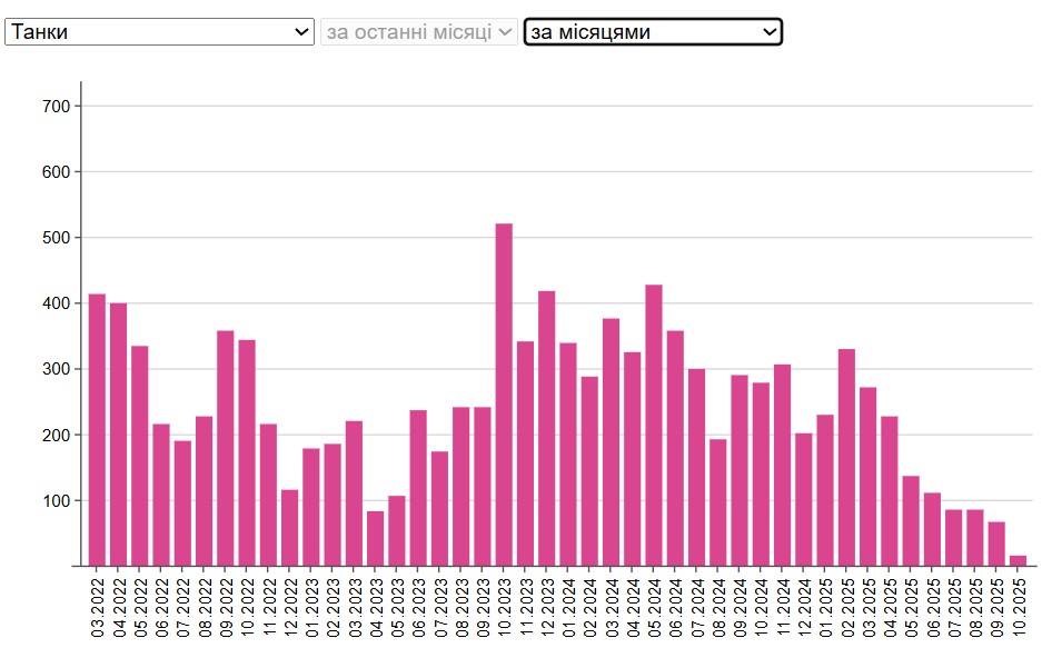 На портале "Минфин" можно увидеть инфографику потерь танков и БМП ВС РФ, составленную на основе данных Генштаба ВСУ. Инфографика показывает, что, ориентировочно, с сентября-ноября 2023 года заметно упало количество уничтоженной бронетехники россиян. При этом ежедневное количество уничтоженной артиллерии, которая активно используют на фронте, не уменьшается.
