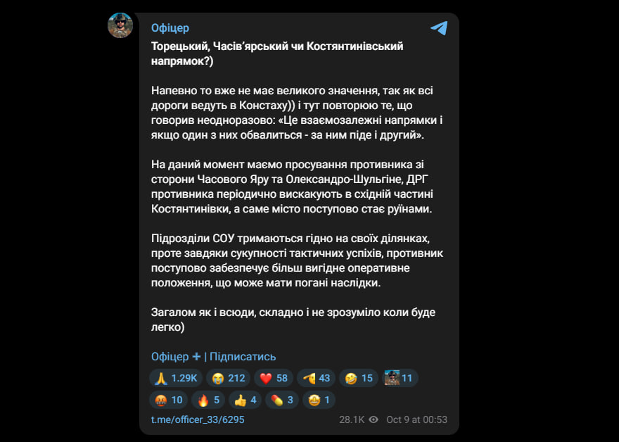 Как сообщил старший лейтенант Сил обороны Украины с позывным "Алекс" в своем Telegram-канале "Офицер", противник продолжает продвижение со стороны Часового Яра и Александро-Шульгино. По его словам, подразделения Сил обороны достойно удерживают свои позиции, однако благодаря совокупности тактических успехов враг постепенно обеспечивает себе более выгодное оперативное положение, что может иметь негативные последствия.