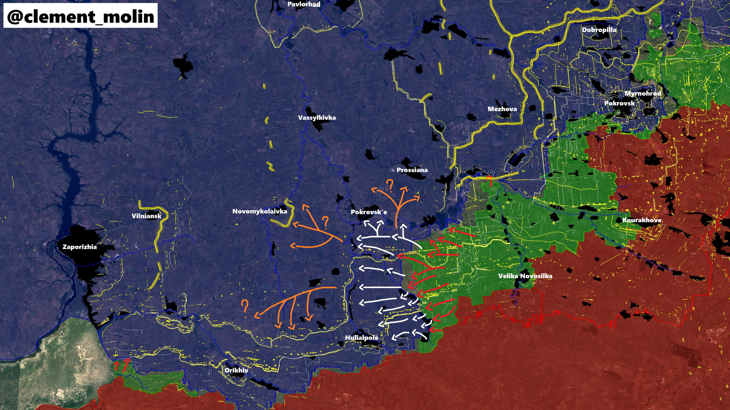 Сообщение Clement Molin появилось в сети 9 октября. Аналитик опубликовал карту участка фронта на границе Днепропетровской и Запорожской областей, и обозначил на ней направления, в которых может развиваться наступление россиян. На карте — три варианта: в сторону поселков Просяная и Покровское (Синельниковский район Днепропетровской области), и в сторону Запорожья. Среди прочего, видим, что противник может зайти с севера на укрепления позади Гуляйполя. На пути в Запорожье, по оценкам аналитика, есть два укрепрайона по трассе N15: у Новониколаевки (в 50 км от областного центра) и Вольнянска (в 15 км).