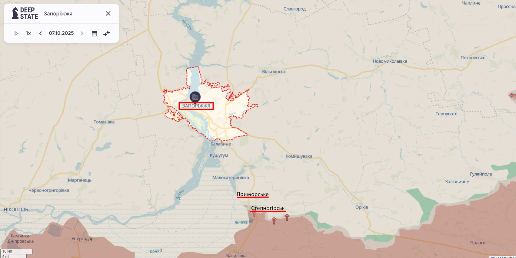 Между тем на карте аналитиков DeepState последние изменения на Запорожском направлении обозначены, ориентировочно, 21-22 сентября. Видим, что населенные пункты, о которых сказал Герасимов, расположены к югу от областного центра на дороге Е-105. Степногорск — почти в серой зоне, в которой идут бои: расстояние до Запорожья — около 21 км (по автотрассе). Приморское — в 3 км от Степногорска, показывает карта аналитиков.