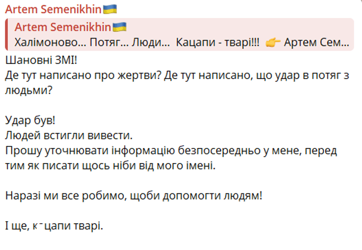"Где здесь написано о жертвах? Где здесь написано, что удар в поезд с людьми? Удар был! Людей успели вывести", – говорится в сообщении.