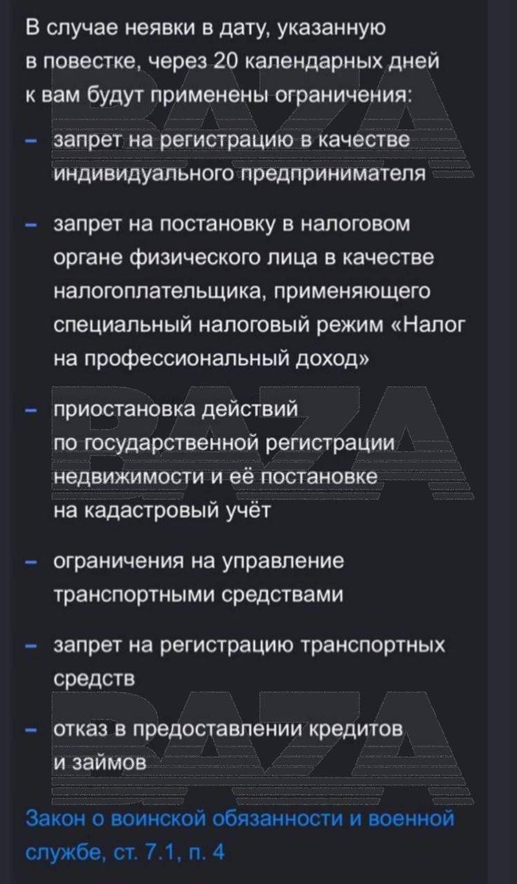 В канале опубликовали два скриншота с данными об электронных повестках. Минобороны РФ предупредило россиянина, что данные о его повестке размещены в специальном реестре и с этого момента у него есть семь дней, чтобы добровольно прийти в военкомат. Если этого не сделать, немедленно заблокируется выезд за границу. Если же россиянин будет игнорировать повестку еще 20 дней, то не сможет получить кредит, информирует Минобороны РФ. Кроме того, будут проблемы с регистрацией имущественных прав (на транспорт, недвижимость) и с предпринимательской деятельностью.