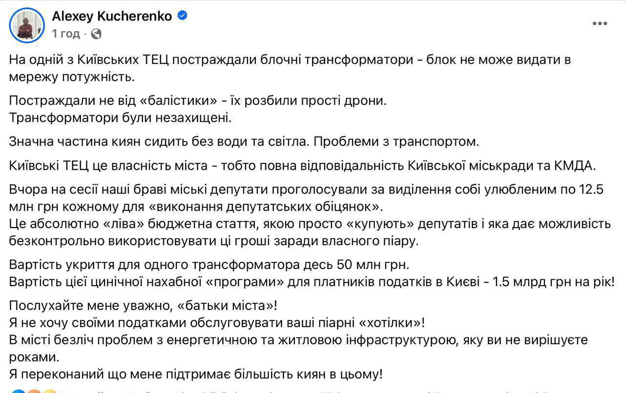 Кучеренко также обратил внимание, что городские депутаты выделили себе по 12,5 млн грн на "выполнение обещаний", тогда как укрытие одного трансформатора стоит около 50 млн грн, а суммарные программы обходятся киевлянам в 1,5 млрд грн в год.