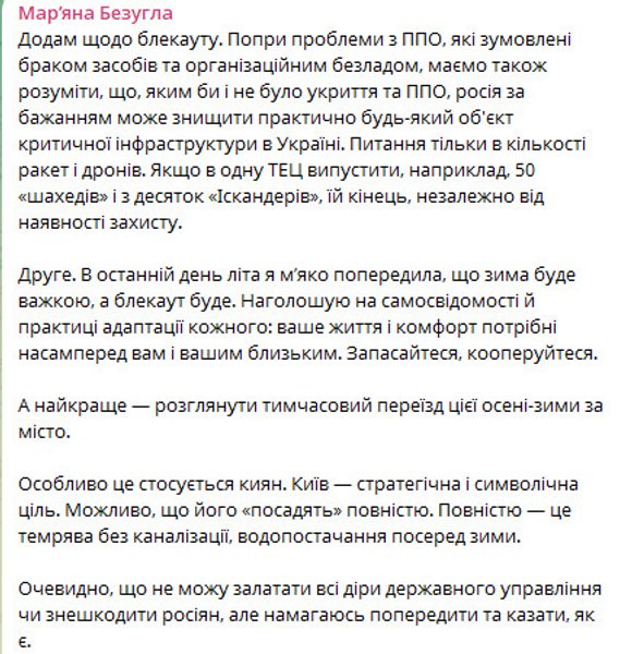 "Добавлю относительно блэкаута. Несмотря на проблемы с ПВО, которые обусловлены нехваткой средств и организационным беспорядком, должны также понимать, что, каким бы ни было укрытие и ПВО, Россия при желании может уничтожить практически любой объект критической инфраструктуры в Украине. Вопрос только в количестве ракет и дронов. Если в одну ТЭЦ выпустить, например, 50 "шахедов" и с десяток "Искандеров", ей конец, независимо от наличия защиты", — написала Безуглая.