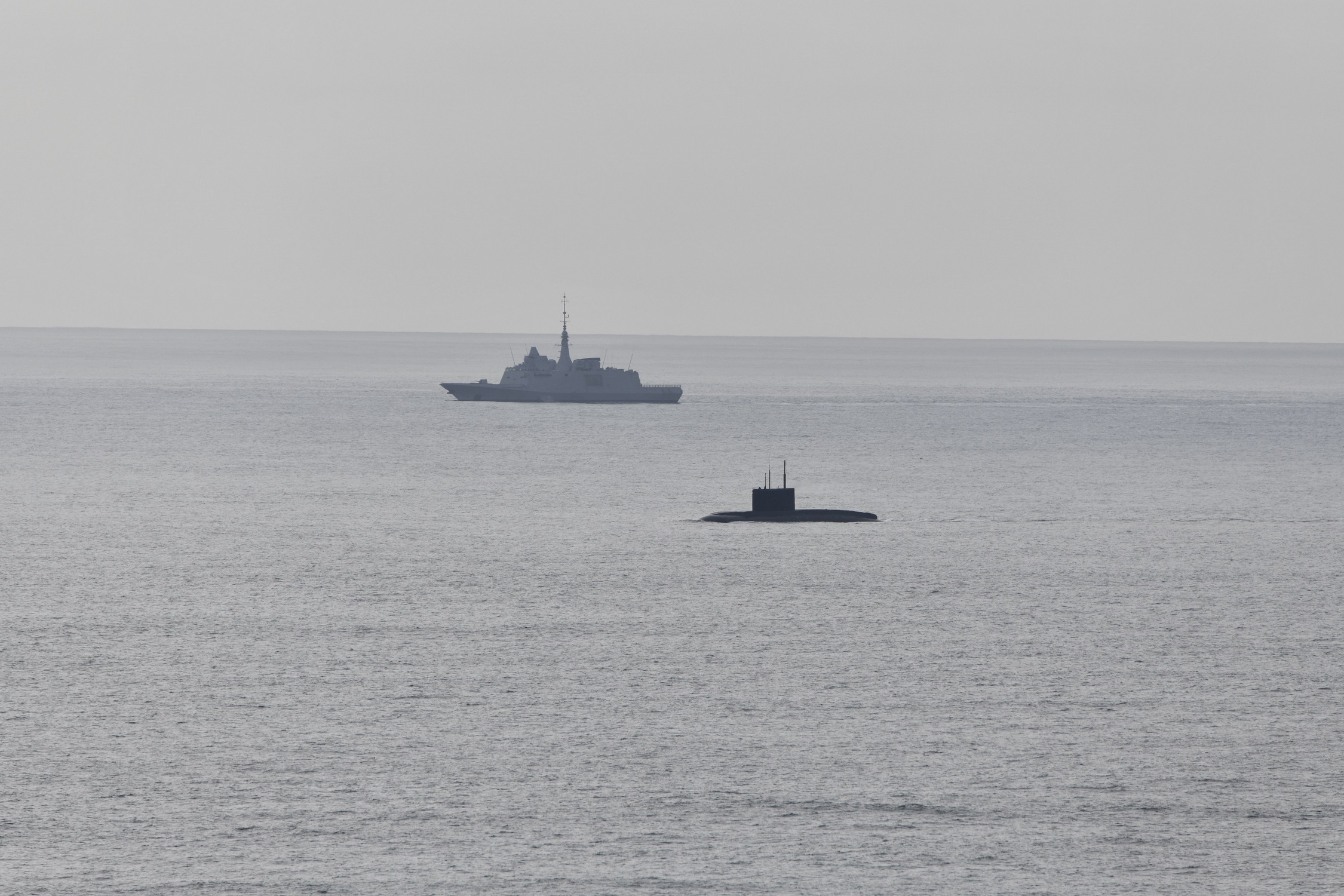 Морское командование НАТО опубликовало два фото с места инцидента с субмариной РФ. В кадр попал французский фрегат и российская подводная лодка. Сравнение двух фото показывает, что лодки двигались друг относительно друга, а на "Новороссийске" не заметно никаких действий экипажа.
