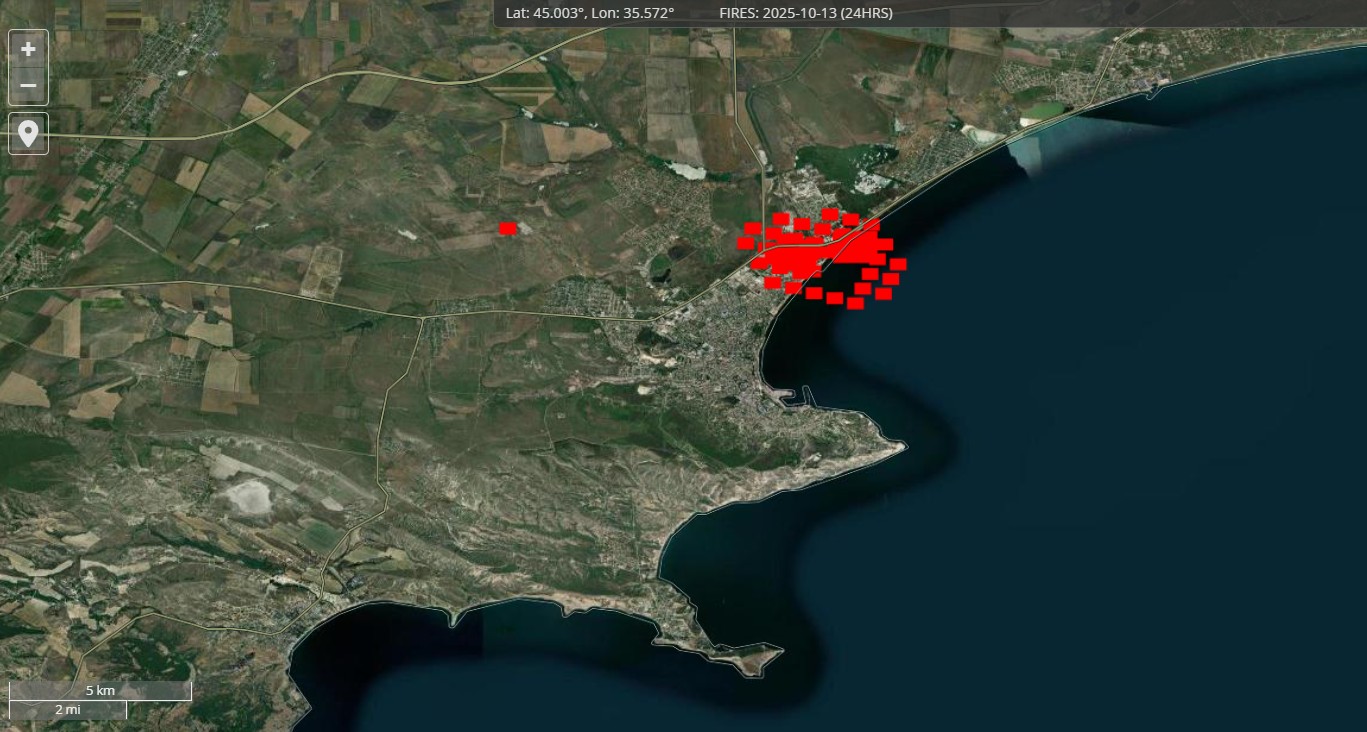 На спутниковой карте пожаров FARMS NASA можно убедиться в возгорании в Феодосии. Ориентировочный диаметр местности с повышенной температурой — около 5 км. Горячие точки сосредоточены в районе морского порта. Между тем в 0:00 13 октября появилось сообщение в канале представителя оккупационной власти Сергея Аксенова: заявил, что произошел налет 20 дронов, которые все якобы сбиты средствами ПВО ВС РФ.