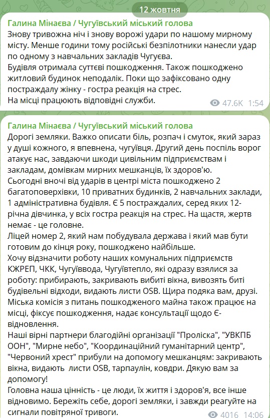 В городе, который находится всего в 64 километрах от фронта, всего за два дня обстрелов повреждены не менее 10 частных домов, две многоэтажки, два учебных заведения и одно административное здание.