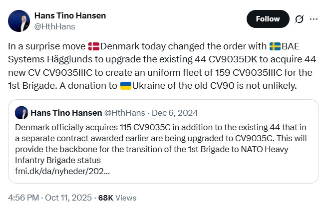 Комментируя новость польский обозреватели Defence24 Адам Сверковски пишет, что есть вероятность передачи Украине списанных датских бронемашин. Дело в том, что на данный момент Украина получила от Швеции 50 машин CV9040C, из которых, по данным сервиса Oryx, не менее 15 единиц безвозвратно утрачено. Кроме того, Киеву будут поставлены 40 машин серии в варианте CV9035 MkIIIC.