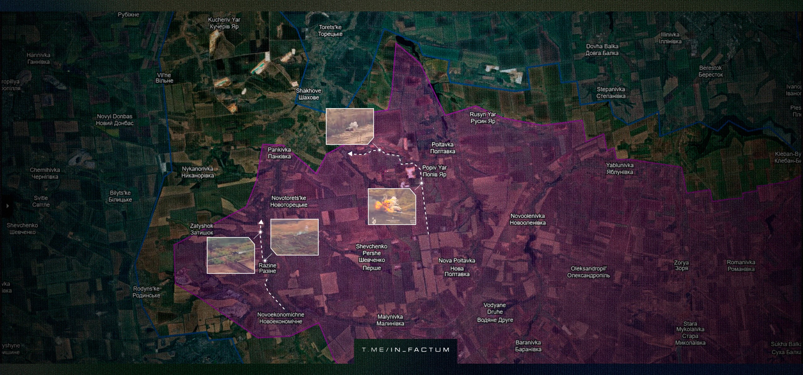 В канале In Factum создали инфографику на основе сообщения бойцов СОУ и геолокации кадров. Аналитики показали четыре точки, в которых атаковали россияне. Указывается, что механизированные штурмы россиян состоялись от сел Новоэкономическое-Новая Полтавка в сторону Шахматного.