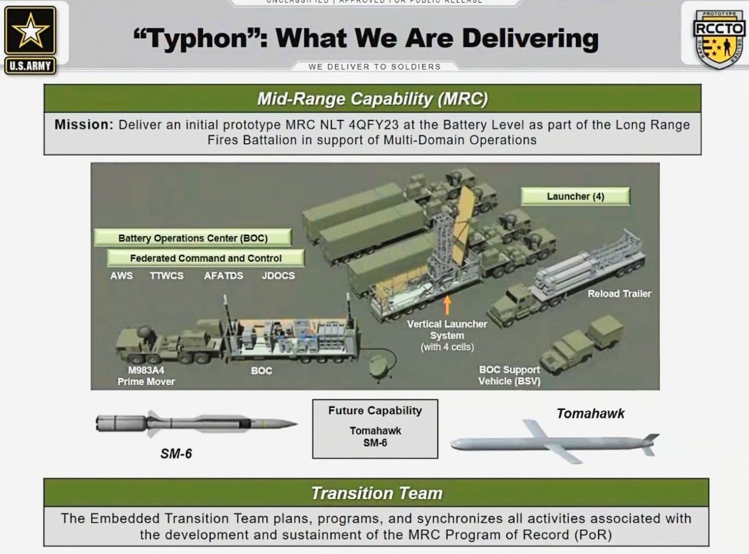 Комплекс Typhon — пусковая установка армии США, способная запускать "Томагавки" (дальность от 900 до 2 500 км) и зенитные ракеты SM-6, рассказали на DE. Недостаток установки — плохая проходимость на сыпучих и влажных грунтах, о чем не подумали во время проектирования. Аналитики объяснили, что у американцев есть две батареи ракетного комплекса Typhon: каждая батарея — это четыре пусковые, командный пункт, зарядная машина, машина поддержки. Каждое транспортное средство — это грузовик с прицепом, из-за чего и возникли проблемы, на которые обратили внимание в Пентагоне во время эксплуатации в Тихом океане.