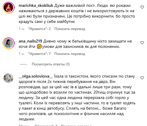 "Очень важный пост. Люди, которые годами наживаются из государственных средств и не используют их на цели, которые были назначены. Это нужно искоренить, потому что просто воруют сами у себя будущее", "Удивительно, почему же родину никто защищать не хочет идти. Условия для защитников как для пленных", "Почему почти все государственное в Украине обеспечивает тебе унижение достоинства на каждом этапе", – пишут под фото.